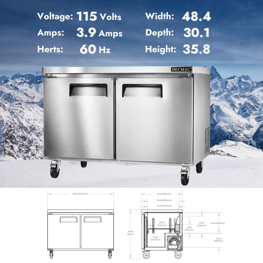 HECMAC 48" Commercial Refrigerator, 12.96 Cu.ft Worktop Undercounter Fridge with 2 Solid Door, 33~40℉, 18-8 Stainless Steel Interior, ETL&NSF/ANSI 7 for Restaurant, Bar, Shop, Kitchen Use